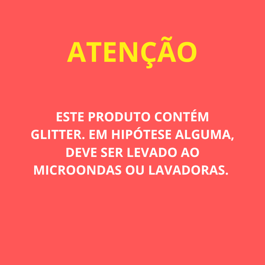 ATENÇÃO: ESTE PRODUTO CONTÉM GLITTER. EM HIPÓTESE ALGUMA, DEVE SER LEVADO AO MICROONDAS OU LAVADORAS.